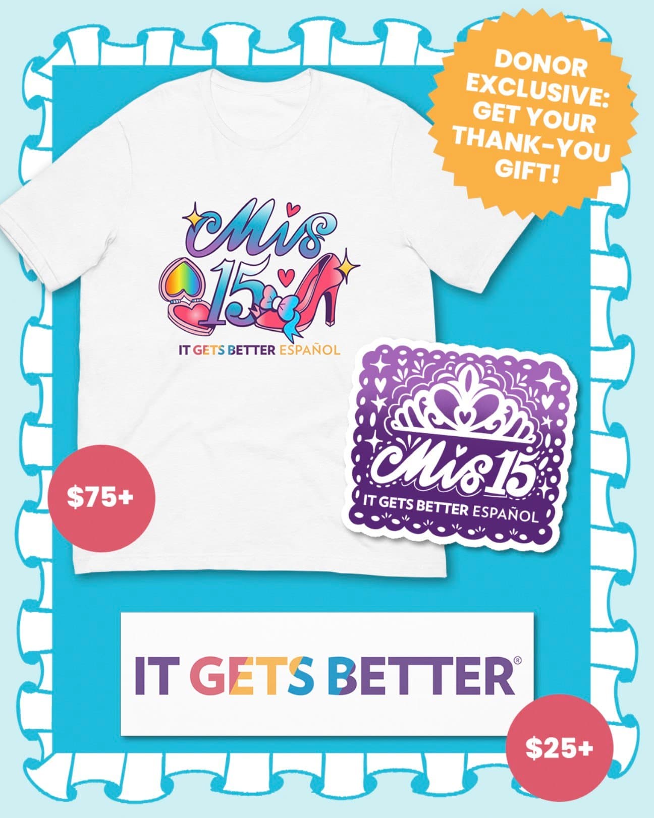 Through October 31, give $25 or more and receive an It Gets Better bumper sticker. Give $75 or more and receive our exclusive quinceañera celebration merch.